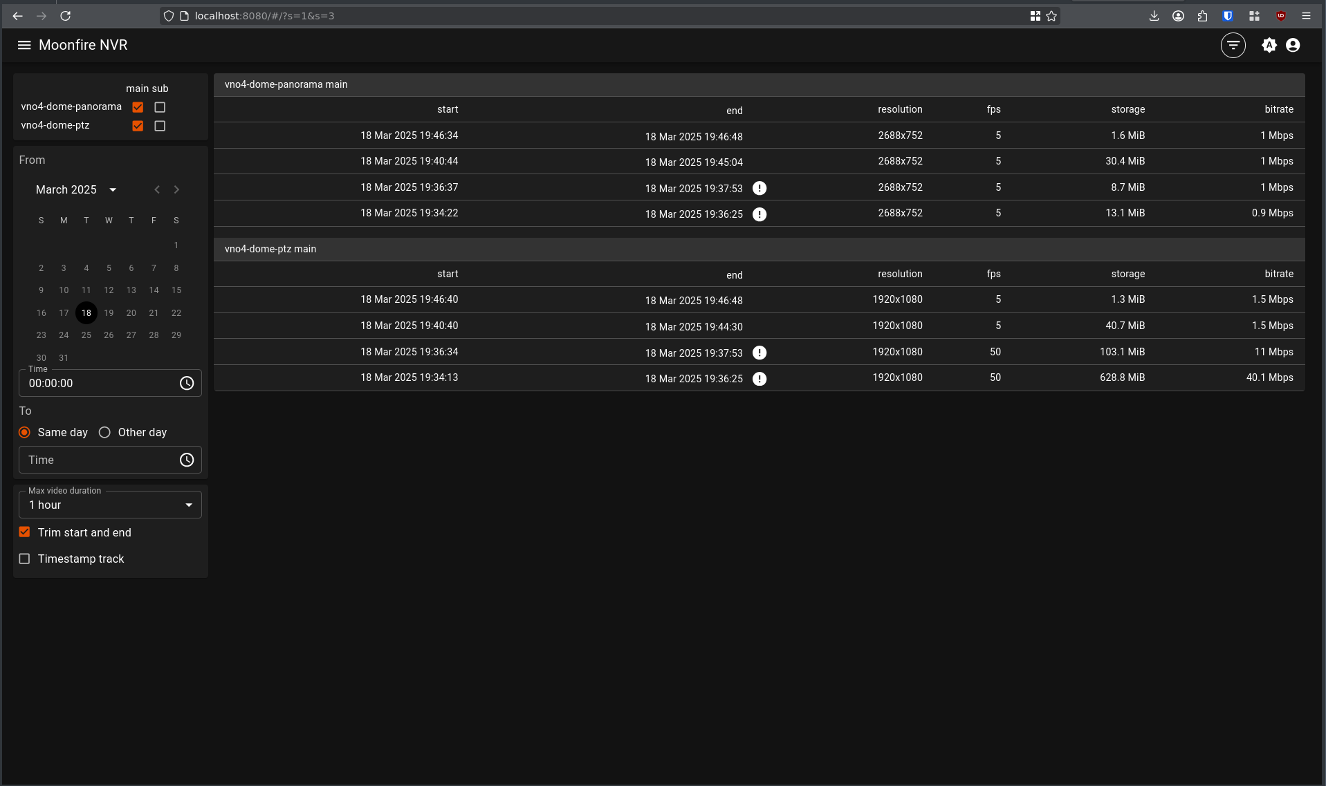 - Open source NVRs, which you can install to your existing home server. I considered frigate, Moonfire NVR and ZoneMinder. Since I use a home server, I am self-hosting my NVR.